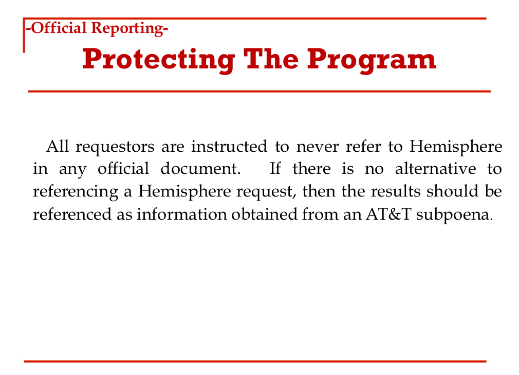 Law enforcement has taken pains to ensure that Hemisphere evades public scrutiny. In fact, as government presentations on the program have made clear, investigators regularly take steps—in the name of “protecting the program”—to “keep the program under the radar.” Most critically, program officials instruct law enforcement to “never refer to Hemisphere in any official document.” Instead, law enforcement hides Hemisphere through a practice called “parallel subpoenaing.” What that means is once police get results back from Hemisphere, they send another subpoena, this time directly to the suspect’s phone provider, to obtain the records for the new phone numbers identified by Hemisphere. The police are then careful to only reference this second request for records in their investigative reports, search warrant affidavits, and court testimony. Through this process, the original results returned by Hemisphere—and the process for obtaining them—are “walled off” from judges, criminal defendants and the public.