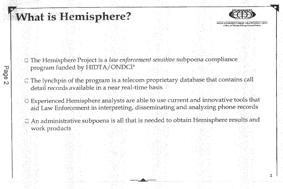 “Hemisphere” came to light amidst the public uproar over revelations that the NSA had been collecting phone records on millions of innocent people. However, Hemisphere wasn’t a program revealed by Edward Snowden’s leaks, but rather its exposure was pure serendipity: a citizen activist in Seattle discovered the program when shocking presentations outlining the program were provided to him in response to regular old public records requests.