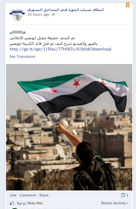 - An attacker who hijacked the Facebook page of the “Revolution Youth Coalition on the Syrian Coast,” and posted a malicious link disguised as investigation of the death of a well-known opposition commander (image right). The attacker then deleted comments warning users of the malware.