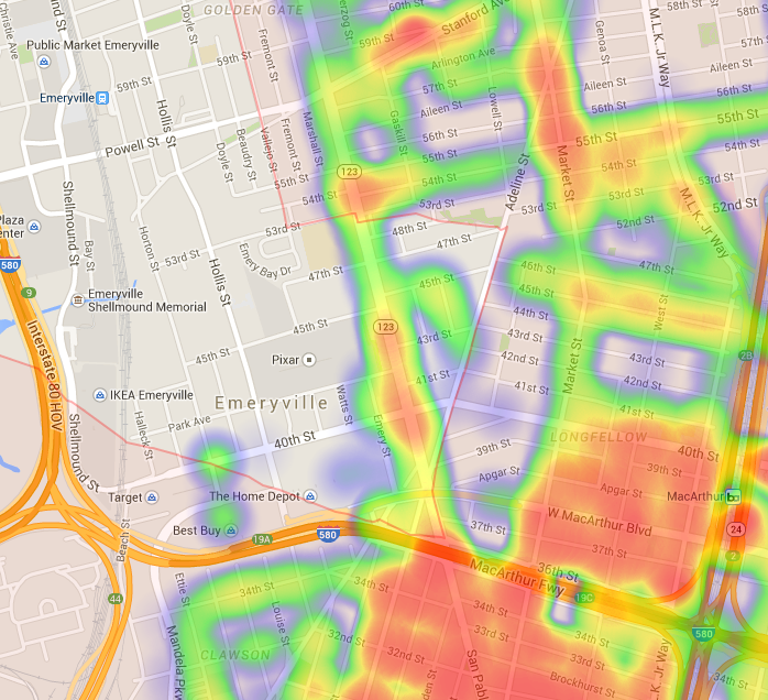 International Blvd. and Fruitvale: The same holds true for International Blvd. and Fruitvale Ave. (though some neighboring areas don’t seem to be targeted at all).