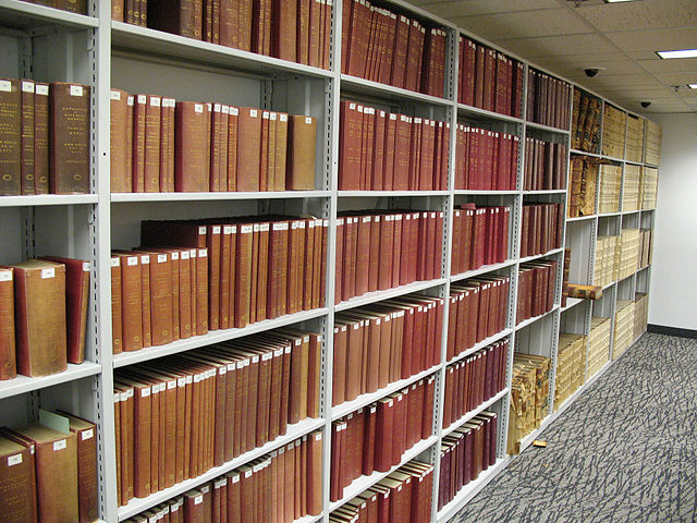 Bound paper copyright catalogs line the shelves of the Copyright Office.