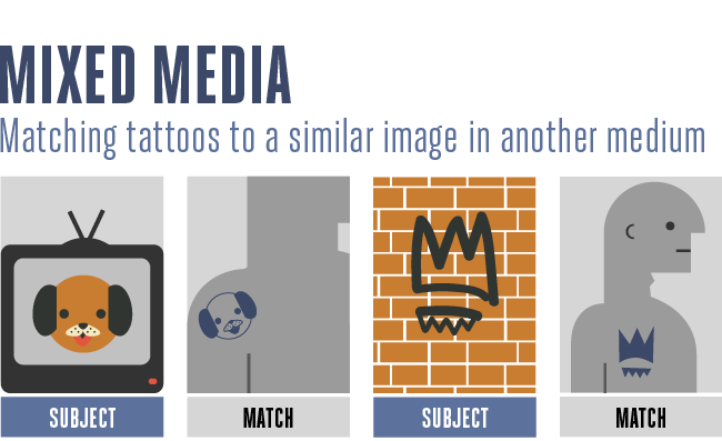 Medios mixtos: Cuando usted consigue un tatuaje, el artista entinta raramente su primer bosquejo en su piel. El artista lo dibujará en papel y luego lo convertirá en una transferencia de color púrpura para trazarlo con las agujas. La pregunta para los investigadores es si un algoritmo puede hacer ingeniería inversa en este proceso; en lugar de hacer coincidir tatuajes con tatuajes, pueden hacer coincidir un tatuaje con una imagen en otro medio.