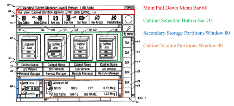 The ’400 patent described its “invention” as “a Graphic User Interface (GUI) that enables a user to virtualize the system and to define secondary storage physical devices through the graphical depiction of cabinets.” In other words, virtual storage cabinets on a computer. E-Bay, Alibaba, and Booking.com, filed a petition for inter partes review arguing that claims from the ’400 patent were obvious in light of the Partition Magic 3.0 User Guide (1997) from PowerQuest Corporation. Three administrative patent judges from the Patent Trial and Appeal Board (PTAB) agreed.