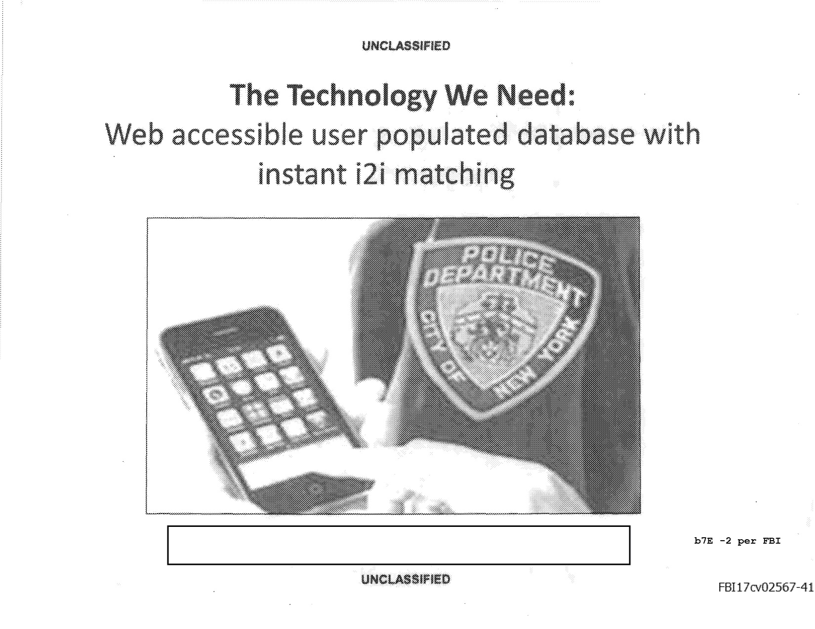 Further in the presentation, the FBI further elaborated on its goals: “The Technology We Need: web accessible user populated database with instant i2i matching” (i2i stands for “image to image”). The slide included a photograph of a New York Police Department officer tinkering with a smartphone.