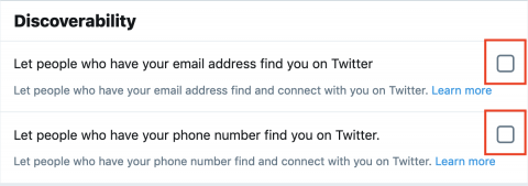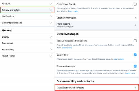 1. To check your discoverability settings, head to the Privacy and safety section of your account settings, then scroll down a bit and select Discoverability and contacts—or just go to https://twitter.com/settings/contacts.