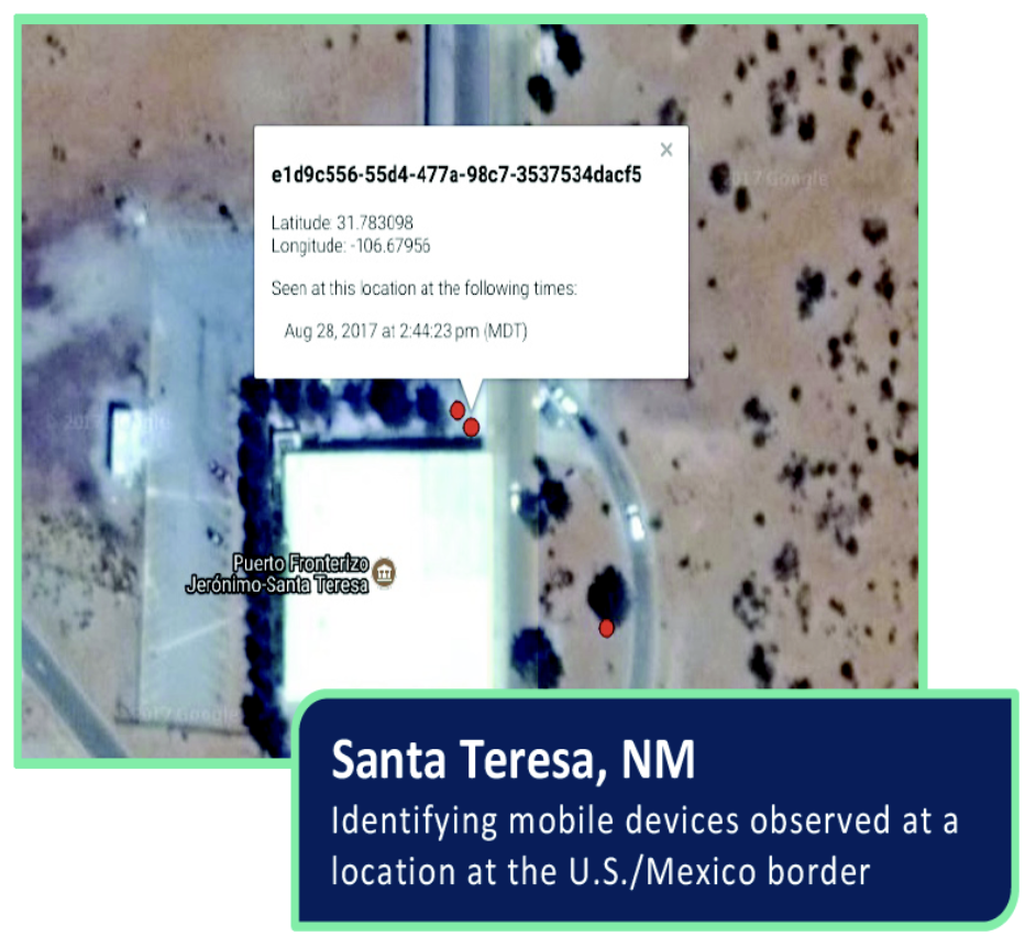 The marketing materials provided by Fog to multiple law enforcement agencies are nearly identical to material that Venntel provided to DHS, according to records obtained by ACLU. The style, much of the language, and several of the graphics appear to be identical. It even appears that both companies use the same screenshot of a location in Santa Teresa, NM to illustrate their capabilities. Furthermore, both companies make identical claims about their data coverage, including that they analyze “location signals from 250 million mobile devices in the U.S.” and “15+ billion daily location signals.” These claims could be evidence that both companies have access to the same dataset.