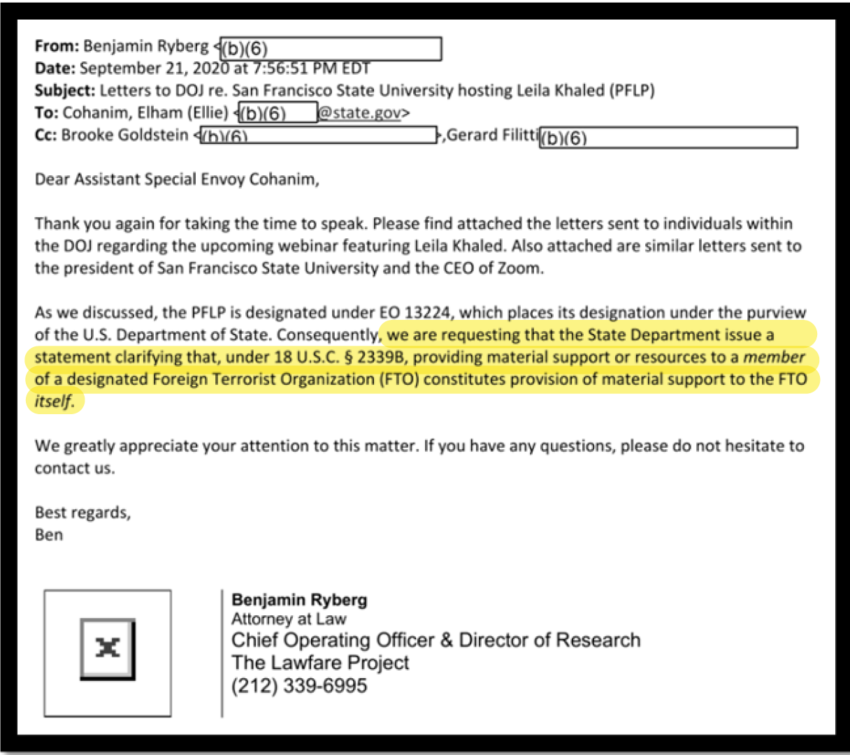 The records reveal that the external pressure came from the Lawfare Project (a non-government-organization not to be confused with the Lawfare blog). Benjamin Ryberg of the Lawfare Project requested that the State Department issue a statement regarding Khaled. Ryberg wanted the State Department to clarify that just by hosting Leila Khaled, SFSU and the tech platforms would be providing material support to a Foreign Terrorist Organization. In one of the released emails, Benjamin Ryberg reached out to Elham (Ellie) Cohanim, a Trump-appointed Deputy Special Envoy to Monitor and Combat Ant-Semitism at the State Department.