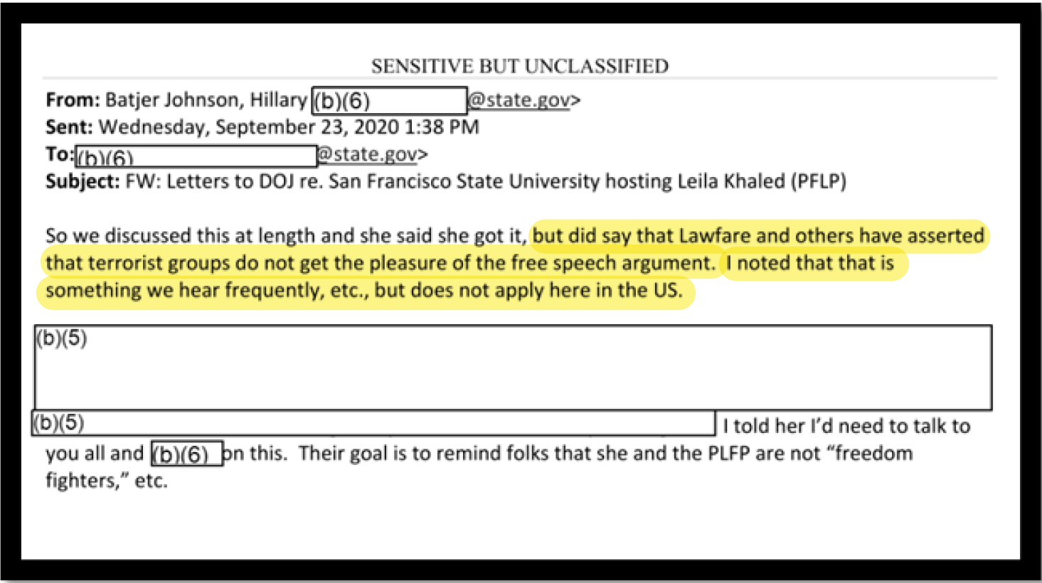 Fortunately, Johnson, also a State Department employee, pushed back on the calls to pressure SFSU to deplatform Leila Khaled. In one email to Ellie Cohanim, Johnson explains, “just as a heads up, we aren’t able to do much regarding issues of free speech” but then offers to chat later.