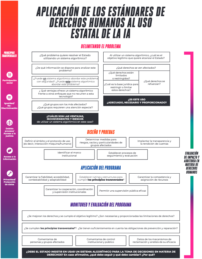 Los principios transversales corresponden a un aparato de base con el que deben contar los Estados a la hora de evaluar y adoptar sistemas de IA/ADM para las determinaciones basadas en derechos. En pocas palabras, una participación social significativa exige funcionarios estatales dedicados, presupuesto, procesos y planificación para que no sea un mero ejercicio de marcar casillas. El acceso a la información requiere rutinas y personal para producir, organizar y divulgar información, tanto activamente como en respuesta a solicitudes, así como un organismo de supervisión independiente con poderes suficientes y efectivos. La igualdad y la no discriminación se basa en la estructura necesaria para una participación social significativa, sobre todo para involucrar grupos históricamente discriminados. También implica la movilización de diversos conocimientos expertos dentro y fuera de las instituciones estatales para evaluar adecuadamente el sistema y el contexto social de aplicación y abordar los posibles problemas. Exige un monitoreo continuo de la aplicación del proyecto, con una supervisión humana competente, responsable y transparente de la herramienta y una producción y análisis de indicadores orientados a la diversidad y los derechos humanos. La privacidad y la protección de datos requiere una infraestructura de seguridad y conocimientos especializados. También incluye disponer de un organismo independiente de supervisión de la protección de datos, además de departamentos o funcionarios estatales que puedan desempeñar el papel de responsables de la protección de datos, junto con medidas y rutinas para satisfacer oportunamente los derechos de los interesados. Por último, el debido proceso/acceso a la justicia exige recursos judiciales y administrativos fácilmente accesibles, equitativos y efectivos. También implica estructuras adecuadas para investigar y castigar las violaciones de los derechos humanos derivadas del uso estatal de los sistemas de IA/ADM, garantizando la reparación y la no repetición.
